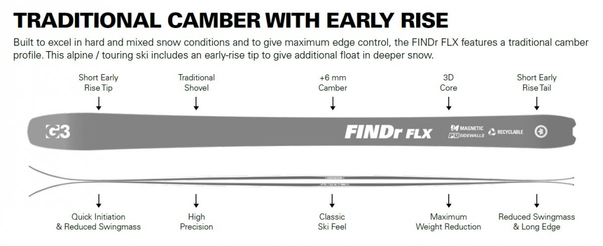 Lyže G3 FINDr jsou yrobeny tak, aby vynikaly ve skialpinistických aplikacích, v tvrdých a smíšených sněhových podmínkách a aby poskytovaly maximální kontrolu nad hranou, FINDr. má tradiční profil camber. Tato skutečná alpská touringová lyže obsahuje špičku s brzským stoupáním, která poskytuje lepší plutí v hlubokém sněhu.
