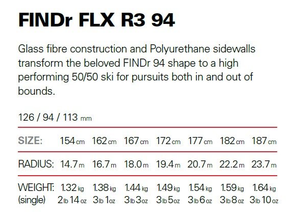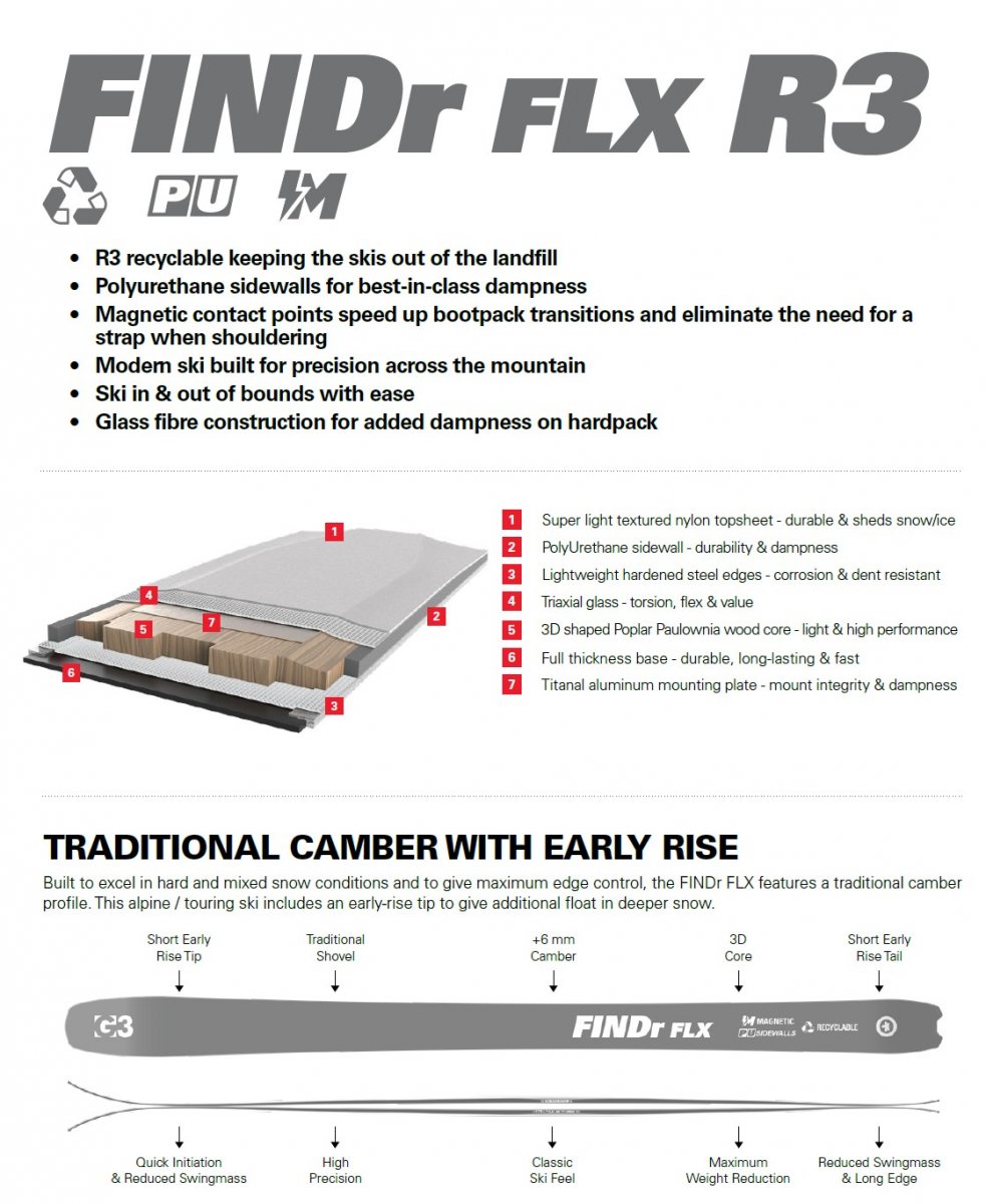 Lyže FINDr FLX, navržené pro vynikající jízdu v tvrdém a smíšeném sněhu a pro maximální kontrolu hran, se vyznačují tradičním klenutým profilem. Tyto sjezdové/turistické lyže mají špičku s rychlým nástupem, která jim poskytuje lepší vztlak v hlubším sněhu.