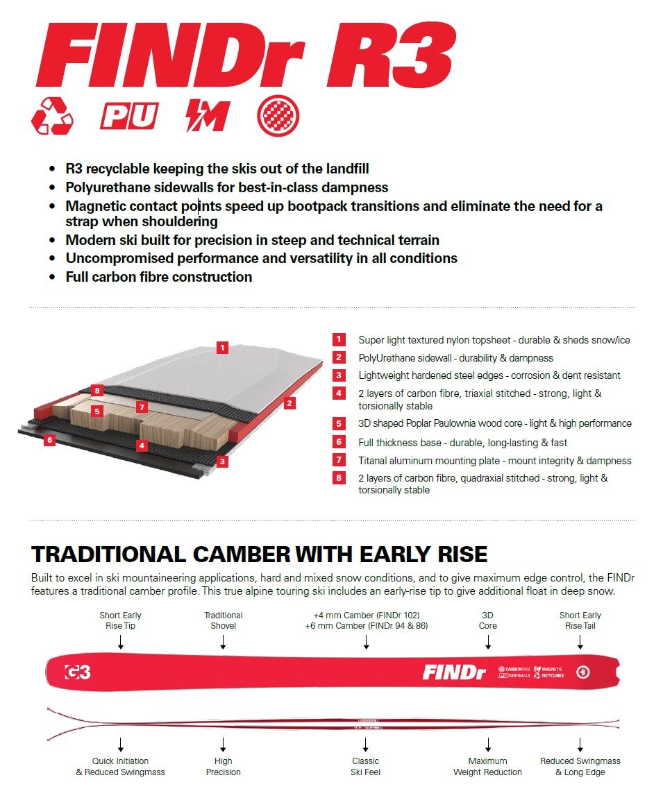 Lyže G3 FINDr jsou yrobeny tak, aby vynikaly ve skialpinistických aplikacích, v tvrdých a smíšených sněhových podmínkách a aby poskytovaly maximální kontrolu nad hranou, FINDr. má tradiční profil camber. Tato skutečná alpská touringová lyže obsahuje špičku s brzským stoupáním, která poskytuje lepší plutí v hlubokém sněhu.