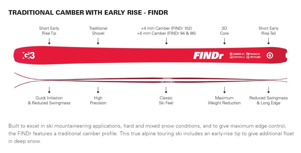 Lyže G3 FINDr jsou yrobeny tak, aby vynikaly ve skialpinistických aplikacích, v tvrdých a smíšených sněhových podmínkách a aby poskytovaly maximální kontrolu nad hranou, FINDr. má tradiční profil camber. Tato skutečná alpská touringová lyže obsahuje špičku s brzským stoupáním, která poskytuje lepší plutí v hlubokém sněhu.