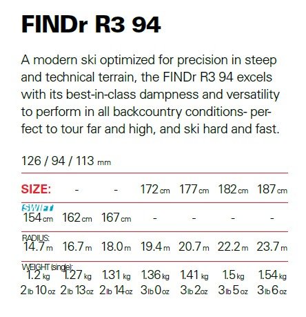 Vyrobeno tak, aby vynikalo ve skialpinistických aplikacích, v tvrdých a smíšených sněhových podmínkách a aby poskytovalo maximální kontrolu nad hranou, FINDr. má tradiční profil camber. Tato skutečná alpská touringová lyže obsahuje špičku s brzským stoupáním, která poskytuje lepší plutí v hlubokém sněhu.