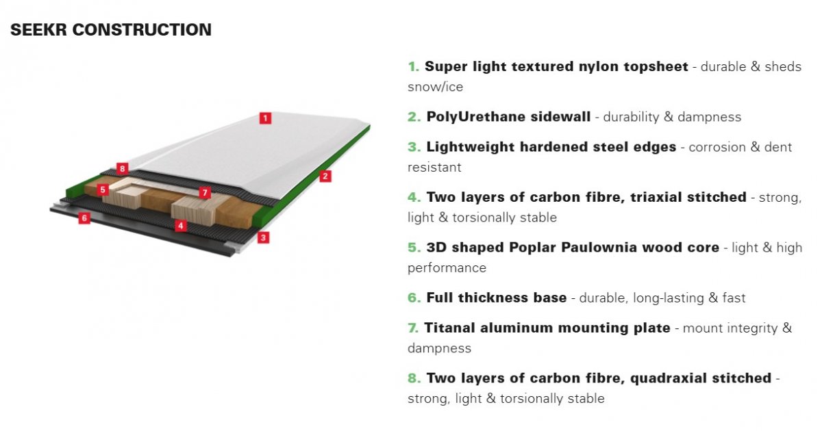 Camber profil +2 mm pro maximální kontrolu a hravost. Short Early rise tip, tedy nadzvednutí špiček i patek lyží zajišťuje nadnášení lyže v hlubokém sněhu. Horní vrstva lyže je vyrobena z prémiového nylonu proti poškrábání a snížení namrzání sněhu. Bočnice z polyuretanu pro vyšší odolnost hran a proti vnikání vlhkosti do lyže. Ocelové hrany jsou odolné vůči korozi. Dřevěné jádro tvoří dřevo z topolu/Paulownie.