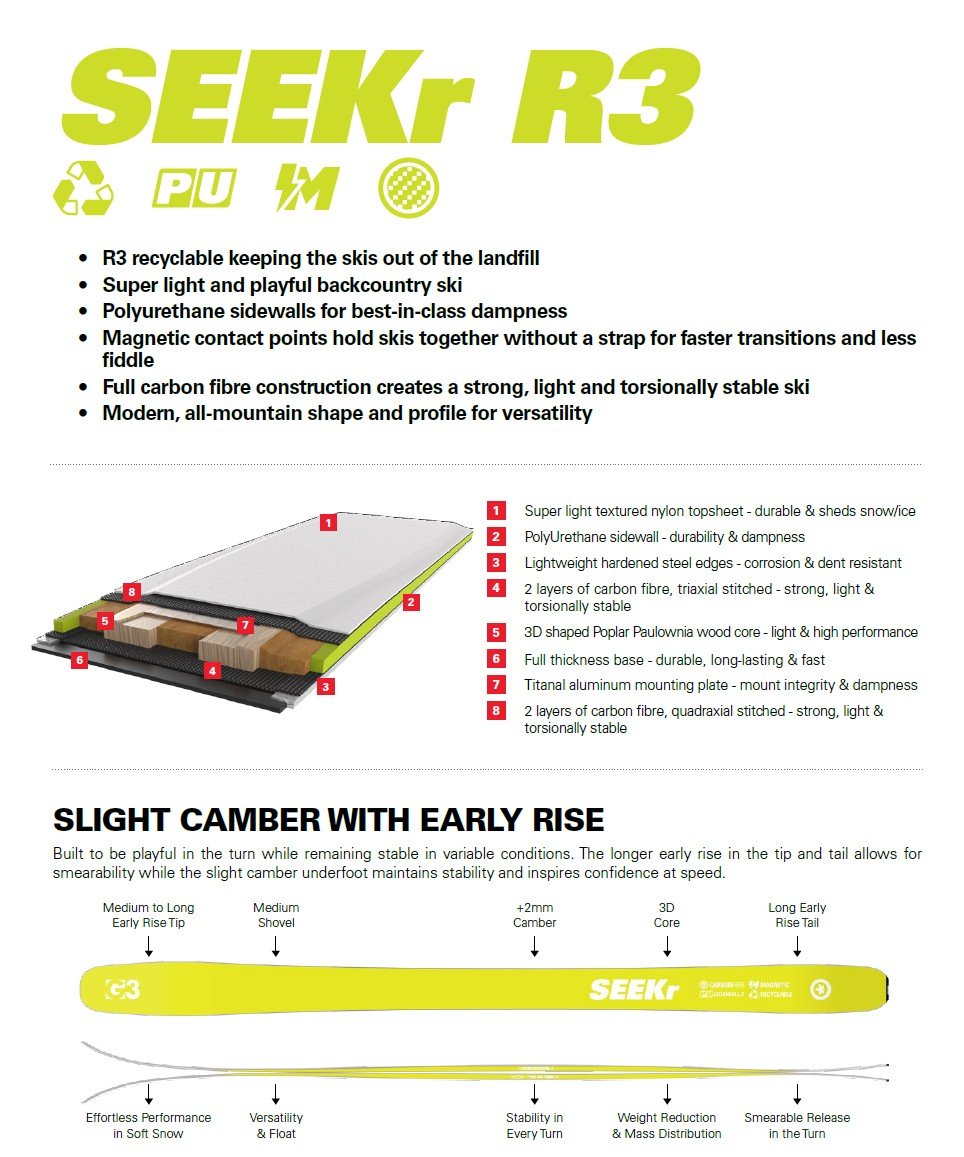 Technologie ?: | MAGNETIC CONTACT POINTS, PU SIDEWALLS, SWIFT, ULTRA PREMIUM CARBON FIBRE MATERIALS, Proč G3 ? / R3 lyže, R3 - RIDE.REPEAT.RECYCLE. |