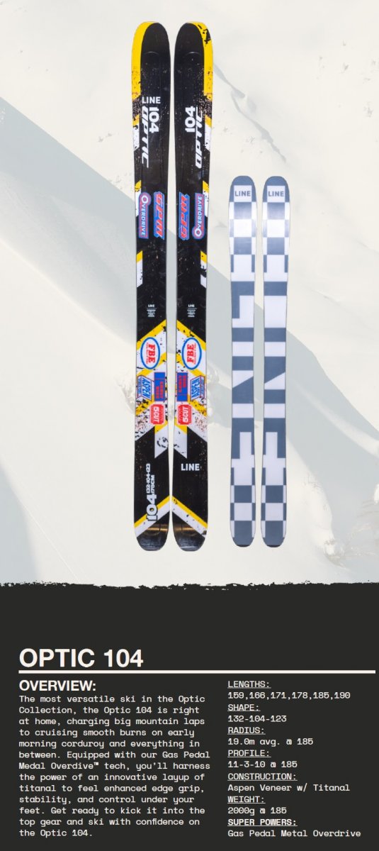 The most versatile ski in the Optic Collection, the Optic 104 is right at home, charging big mountain laps to cruising smooth burns on early morning corduroy and everything in between. Equipped with our Gas Pedal Medal Overdive™ tech, you'll harness the power of an innovative layup of titanal to feel enhanced edge grip, stability, and control under your feet. Get ready to kick it into the top gear and ski with confidence on the Optic 104středně