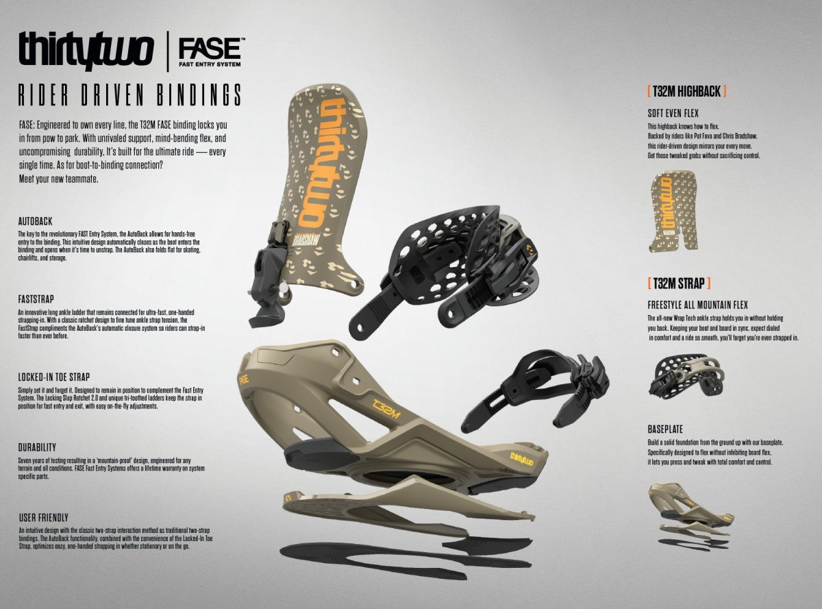 Toto není běžné vázání -- THIRTYTWO T32M FASE kombinuje výkon a pohodlí klasického dvoupáskového vázání s novou úrovní rychlosti a pohodlnosti díky systému FASE - Fast Entry System. Bez nutnosti kompromisů čekání, natahování a utrácení času na každém výjezdu -- prostě vložíš botu do vázání, vázání se automaticky „zacvakne" a můžeš jet. Tento model je navržený pro jezdce, kteří chtějí maximální efektivitu ve světě freeridu i v parku, s podpůrným „locked-in" pocitem, stabilitou, i jemností, kterou očekávají od prémiového vybavení.