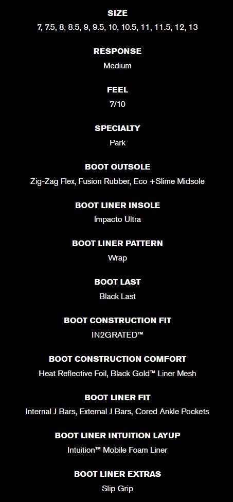 | Technologie ?: | 1:1 Lasting, 3D FORMED TONGUE, 80% Recycled, FSC® Certified Cardboard Packaging, 99% Recycled Packaging Paper, Articulated Cuff, BLACK GOLD LINER MESH, BLACK LAST, BOA® Tongue Tied™, Cored Ankle Pockets, ECO +Slime Midsole, EXTERNAL J BARS, Fusion Rubber, HDR PREMIUM SYNTHETICS, HEAT REFLECTIVE FOIL, IMPACTO ULTRA INSOLE, IN2GRATED CONSTRUCTION, INTERNAL J BARS, Intuition™ Mobile Foam Liner, Rebound Heel Counter, Removable Liner, RIDE BOOT TECHNOLOGY, Rubber Toe Cap, SLIP/GRIP LINER CLOSURE, Traditional Lacing, Wrap Liner, Zig-Zag Flex Outsole |