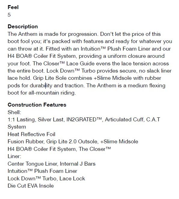 Snowboardové boty Ride Anthem BOA je stvořena pro pokrok. Nenechte se zmást cenou této boty; je plná funkcí a připravena na cokoli, co na ni postavíte. Je vybavena pěnovou vložkou Intuition™ Plush Foam Liner a naším systémem H4 BOA® Coiler Fit, který zajišťuje rovnoměrné uchycení kolem nohy. Systém Closer™ Lace Guide rovnoměrně napíná tkaničky v celé botě. Systém Lock Down™ Turbo zajišťuje bezpečné uchycení tkaniček bez prověšení. Podešev Grip Lite Sole kombinuje mezipodešev Slime s gumovými výztuhami pro odolnost a trakci. Anthem je středně flexibilní bota pro all-mountain ježdění.