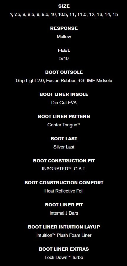 | Technologie ?: | 1:1 Lasting, 3D FORMED TONGUE, 80% Recycled, FSC® Certified Cardboard Packaging, 99% Recycled Packaging Paper, Articulated Cuff, BOA® Fit System Featuring H4 Coiler Lacing, C.A.T. (Calf Adjustment Technology), DIE CUT EVA, Fusion Rubber, Grip Lite 2.0 Outsole, HEAT REFLECTIVE FOIL, IN2GRATED CONSTRUCTION, INTERNAL J BARS, INTUITION™ PLUSH FOAM LINER, Lace Lock, LOCK DOWN™ TURBO LINER LACING, Rebound Heel Counter, Removable Liner, RIDE BOOT TECHNOLOGY, SILVER LAST, The Closer™ Lacing, TX3 Lacing |