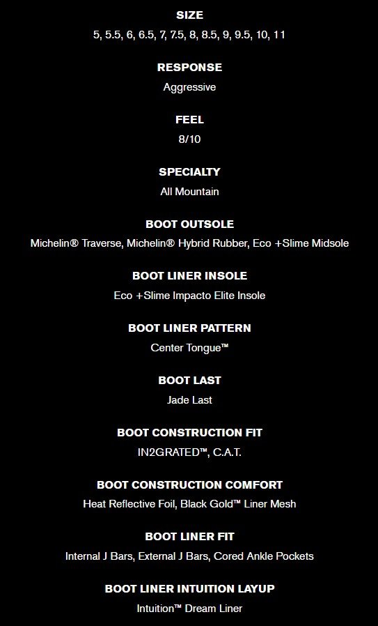 | Technologie ?: | 1:1 Lasting, 3D FORMED TONGUE, 80% Recycled, FSC® Certified Cardboard Packaging, 99% Recycled Packaging Paper, Articulated Cuff, BLACK GOLD LINER MESH, C.A.T. (Calf Adjustment Technology), Cored Ankle Pockets, ECO +Slime Impacto Insole, ECO +Slime Midsole, EXTERNAL J BARS, HDR PREMIUM SYNTHETICS, HEAT REFLECTIVE FOIL, IN2GRATED CONSTRUCTION, INTERNAL J BARS, INTUITION™ DREAM LINER, JADE LAST, Lace Lock, MICHELIN® HYBRID RUBBER, Michelin® Traverse Outsole, REBOUND HEEL COUNTER™ 2.0, Removable Liner, REMOVE_Eco +Slime Impacto Insole, RIDE BOOT TECHNOLOGY, The Closer™ Lacing, Transition Wrap Harness Liner Lacing:, TX3 Lacing, Zonal BOA® Fit System: |