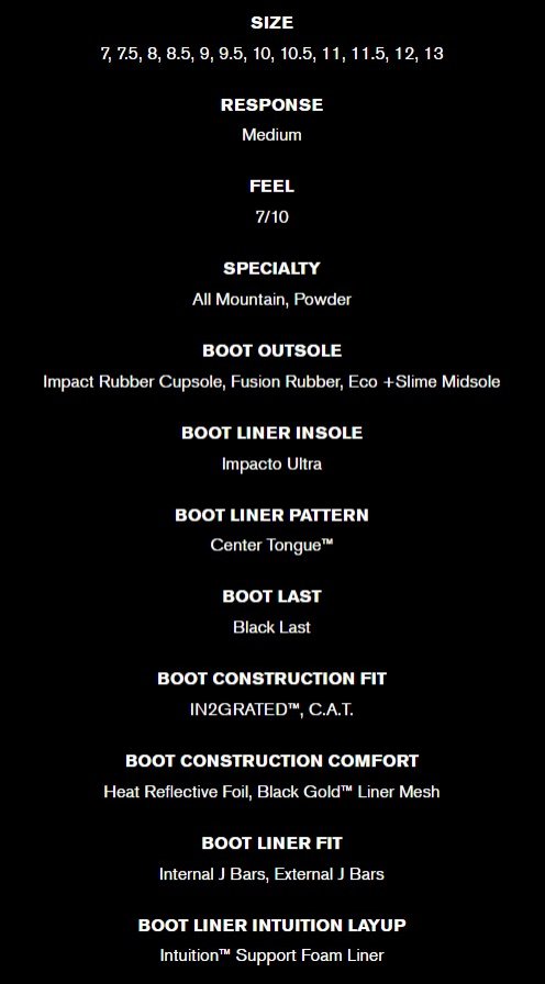 | Technologie ?: | 1:1 Lasting, 3D FORMED TONGUE, 80% Recycled, FSC® Certified Cardboard Packaging, 99% Recycled Packaging Paper, Articulated Cuff, BLACK GOLD LINER MESH, BLACK LAST, BOA® Tongue Tied™, C.A.T. (Calf Adjustment Technology), ECO +Slime Midsole, EXTERNAL J BARS, Fusion Rubber, HDR PREMIUM SYNTHETICS, HEAT REFLECTIVE FOIL, Impact Rubber Cupsole, IMPACTO ULTRA INSOLE, IN2GRATED CONSTRUCTION, INTERNAL J BARS, INTUITION™ SUPPORT FOAM LINER, Lace Lock, Removable Liner, RIDE BOOT TECHNOLOGY, Tongue Tied™ Hybrid Harness, TX3 Lacing, Zonal BOA® Fit System: |