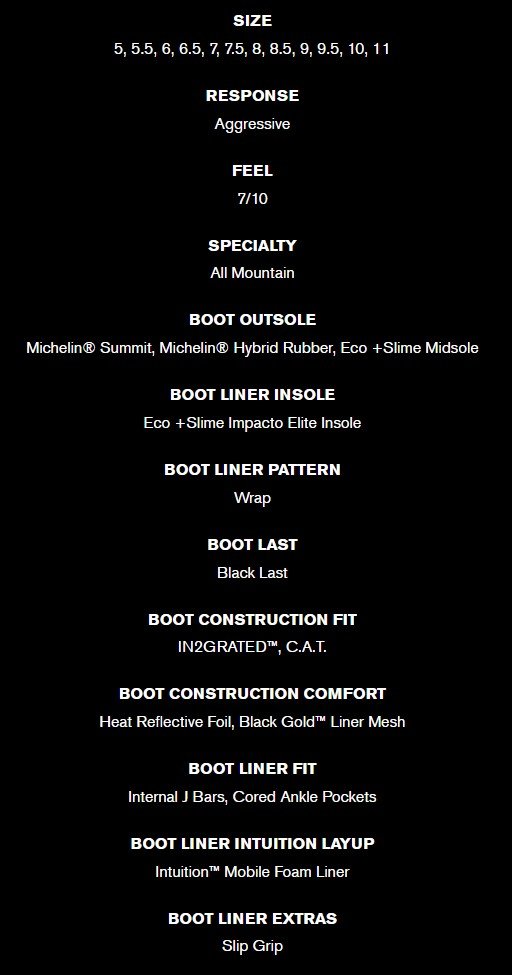 | Technologie ?: | 1:1 Lasting, 3D FORMED TONGUE, 80% Recycled, FSC® Certified Cardboard Packaging, 99% Recycled Packaging Paper, Articulated Cuff, BLACK GOLD LINER MESH, BLACK LAST, BOA® Fit System Featuring H4 Coiler Lacing, BOA® Tongue Tied™, BOA® Tongue Tied™ Hybrid Harness, C.A.T. (Calf Adjustment Technology), Cored Ankle Pockets, ECO +Slime Impacto Insole, ECO +Slime Midsole, HDR PREMIUM SYNTHETICS, HEAT REFLECTIVE FOIL, IN2GRATED CONSTRUCTION, INTERNAL J BARS, Intuition™ Mobile Foam Liner, MICHELIN® HYBRID RUBBER, Michelin® Summit Outsole, REBOUND HEEL COUNTER™ 2.0, Removable Liner, REMOVE_Eco +Slime Impacto Insole, RIDE BOOT TECHNOLOGY, Rubber Toe Cap, SLIP/GRIP LINER CLOSURE, The Closer™ Lacing, TX3 Lacing, Wrap Liner |