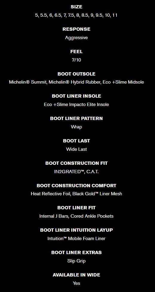 | Technologie ?: | 1:1 Lasting, 3D FORMED TONGUE, 80% Recycled, FSC® Certified Cardboard Packaging, 99% Recycled Packaging Paper, Articulated Cuff, BLACK GOLD LINER MESH, BLACK LAST, BOA® Fit System Featuring H4 Coiler Lacing, BOA® Tongue Tied™, BOA® Tongue Tied™ Hybrid Harness, C.A.T. (Calf Adjustment Technology), Cored Ankle Pockets, ECO +Slime Impacto Insole, ECO +Slime Midsole, HDR PREMIUM SYNTHETICS, HEAT REFLECTIVE FOIL, IN2GRATED CONSTRUCTION, INTERNAL J BARS, Intuition™ Mobile Foam Liner, MICHELIN® HYBRID RUBBER, Michelin® Summit Outsole, REBOUND HEEL COUNTER™ 2.0, Removable Liner, REMOVE_Eco +Slime Impacto Insole, RIDE BOOT TECHNOLOGY, Rubber Toe Cap, SLIP/GRIP LINER CLOSURE, The Closer™ Lacing, TX3 Lacing, Wide Last, Wrap Liner |