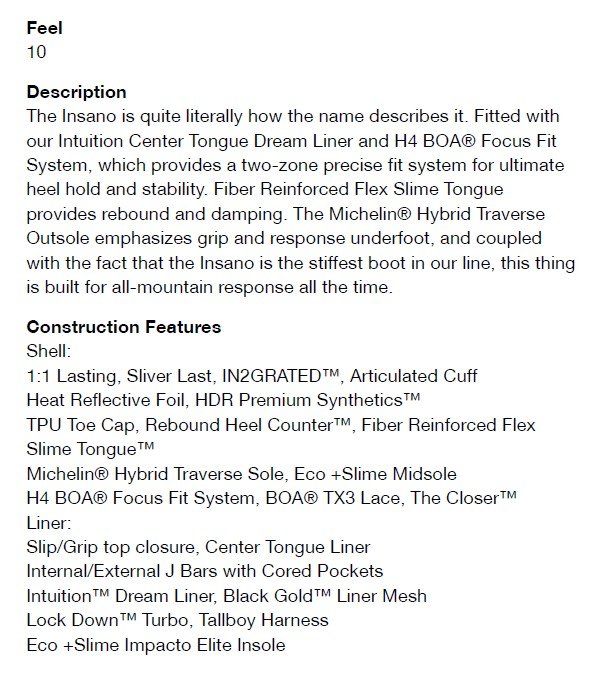 Pánské snowboardové boty RIDE Insano BOA jsou nejtvrdší pánské boty z portfolia této legendární firmy. Tyto boty jsou optimální variantou pro všechny, kteří mají rádi agresivní jízdu po hranách a hledají boty s maximálním přenosem energie a precizní odezvou. K tomu si připojte pohodlí, skvělou tepelnou izolaci, novou podrážku MICHELIN Traverse a máte jedny z nejlepších bot na trhu!