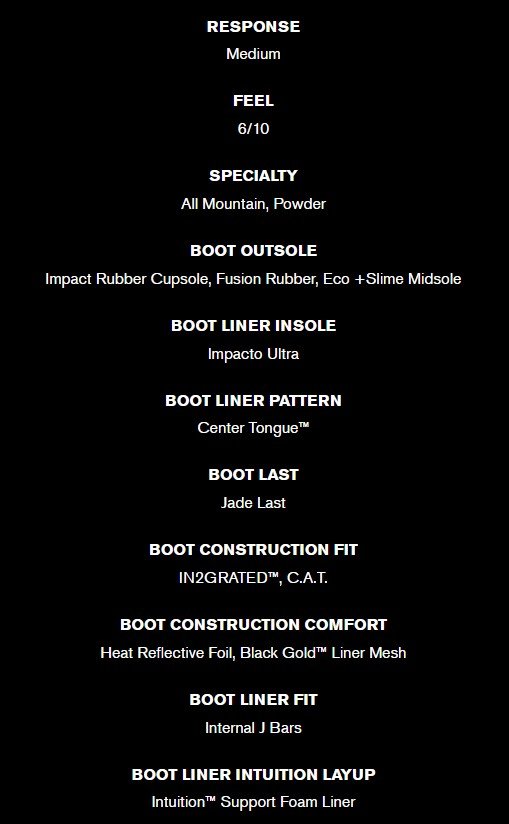 | Technologie ?: | 1:1 Lasting, 3D FORMED TONGUE, 80% Recycled, FSC® Certified Cardboard Packaging, 99% Recycled Packaging Paper, Articulated Cuff, BLACK GOLD LINER MESH, BOA® Tongue Tied™, C.A.T. (Calf Adjustment Technology), ECO +Slime Midsole, Fusion Rubber, HDR PREMIUM SYNTHETICS, HEAT REFLECTIVE FOIL, Impact Rubber Cupsole, IMPACTO ULTRA INSOLE, IN2GRATED CONSTRUCTION, INTERNAL J BARS, INTUITION™ SUPPORT FOAM LINER, JADE LAST, Lace Lock, Removable Liner, RIDE BOOT TECHNOLOGY, Tongue Tied™ Hybrid Harness, TX3 Lacing, Zonal BOA® Fit System: |