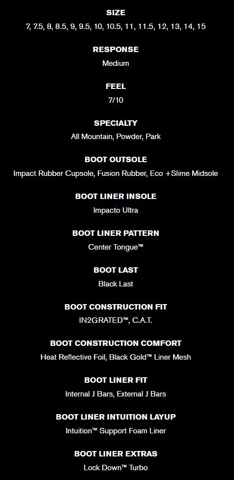 | Technologie ?: | 1:1 Lasting, 3D FORMED TONGUE, 80% Recycled, FSC® Certified Cardboard Packaging, 99% Recycled Packaging Paper, Articulated Cuff, BLACK GOLD LINER MESH, BLACK LAST, BOA® Fit System Featuring H4 Coiler Lacing, BOA® Tongue Tied™, C.A.T. (Calf Adjustment Technology), ECO +Slime Midsole, EXTERNAL J BARS, Fusion Rubber, HDR PREMIUM SYNTHETICS, HEAT REFLECTIVE FOIL, Impact Rubber Cupsole, IMPACTO ULTRA INSOLE, IN2GRATED CONSTRUCTION, INTERNAL J BARS, INTUITION™ SUPPORT FOAM LINER, Lace Lock, LOCK DOWN™ TURBO LINER LACING, Removable Liner, RIDE BOOT TECHNOLOGY, The Closer™ Lacing, TX3 Lacing |