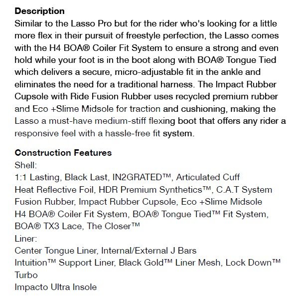 SNB boty Ride Laso Boa jsou podobné jako Lasso Pro, ale pro jezdce, kteří hledají trochu více flexibility při snaze o dokonalost freestylu, Lasso přichází se systémem H4 BOA® Coiler Fit, který zajišťuje silné a rovnoměrné držení, když máte nohu v botě. BOA® Tongue Tied™, který poskytuje bezpečné, mikronastavitelné uchycení v kotníku a eliminuje potřebu tradičního postroje. Impact Rubber Cupsole s Ride Fusion Rubber využívá recyklovanou prémiovou pryž a mezipodešev Eco + Slime pro trakci a odpružení, díky čemuž je Ride Lasso nezbytnou středně tuhou ohebnou botou, která každému jezdci nabízí citlivý pocit díky bezproblémovému fit systému.