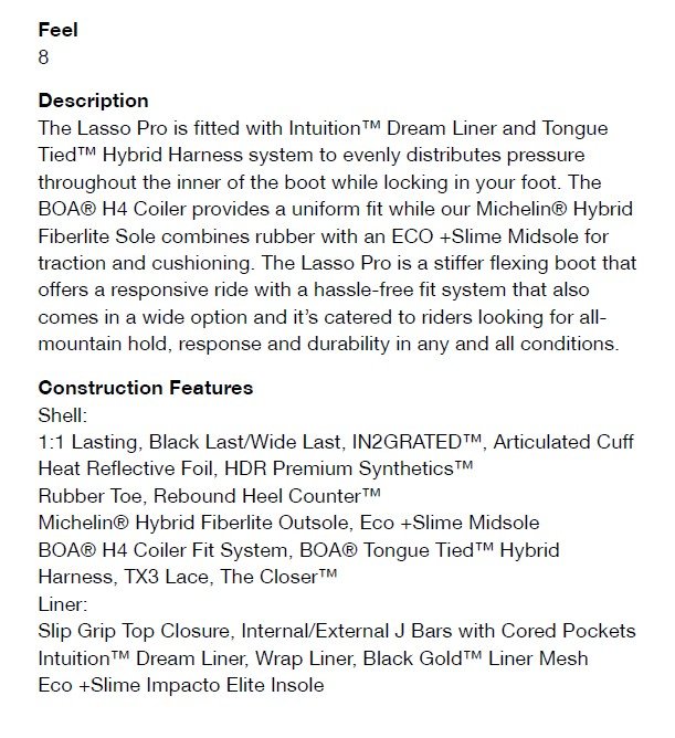 Bota Ride Lasso Pro je vybavena systémem Intuition™ Dream Liner a Tongue Tied™ Hybrid Harness, který rovnoměrně rozkládá tlak po celé vnitřní straně boty a zároveň fixuje nohu. Technologie BOA® H4 Coiler zajišťuje rovnoměrné padnutí, zatímco naše podrážka Michelin® Hybrid Fiberlite kombinuje gumu s mezipodešví ECO +Slime pro trakci a odpružení. Bota Lasso Pro je tužší a flexibilnější, nabízí responzivní jízdu s bezproblémovým systémem přizpůsobení, který je k dispozici v široké škále variant a je určena pro jezdce, kteří hledají all-mountain přilnavost, odezvu a odolnost za všech podmínek.