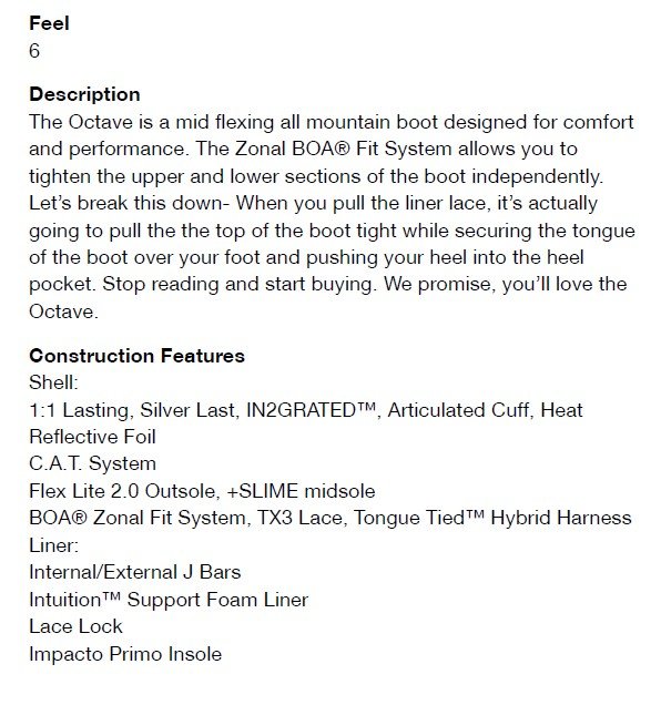 | Technologie ?: | 1:1 Lasting, 3D FORMED TONGUE, 80% Recycled, FSC® Certified Cardboard Packaging, 99% Recycled Packaging Paper, Articulated Cuff, BOA® Tongue Tied™, C.A.T. (Calf Adjustment Technology), EXTERNAL J BARS, FLEX LITE 2.0 Outsole, Fusion Rubber, HEAT REFLECTIVE FOIL, IMPACTO PRIMO INSOLE, IN2GRATED CONSTRUCTION, INTERNAL J BARS, INTUITION™ SUPPORT FOAM LINER, Lace Lock, Removable Liner, RIDE BOOT TECHNOLOGY, SILVER LAST, Tongue Tied™ Hybrid Harness, TX3 Lacing, Zonal BOA® Fit System: |