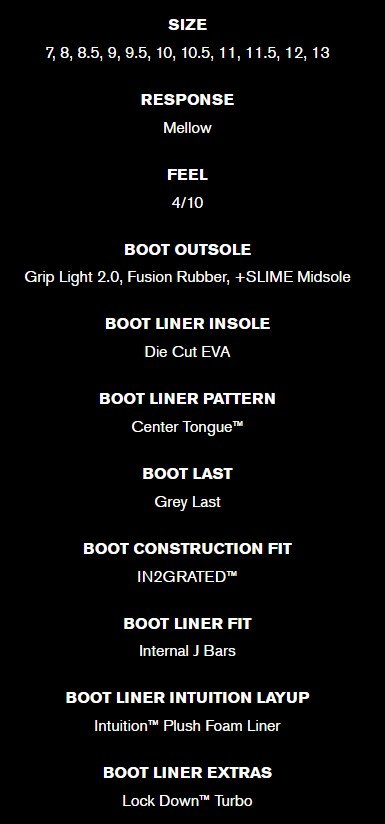 | Technologie ?: | 1:1 Lasting, 3D FORMED TONGUE, 80% Recycled, FSC® Certified Cardboard Packaging, 99% Recycled Packaging Paper, Articulated Cuff, DIE CUT EVA, Fusion Rubber, GREY LAST, Grip Lite 2.0 Outsole, IN2GRATED CONSTRUCTION, INTERNAL J BARS, INTUITION™ PLUSH FOAM LINER, Lace Lock, LOCK DOWN™ TURBO LINER LACING, RIDE BOOT TECHNOLOGY |
