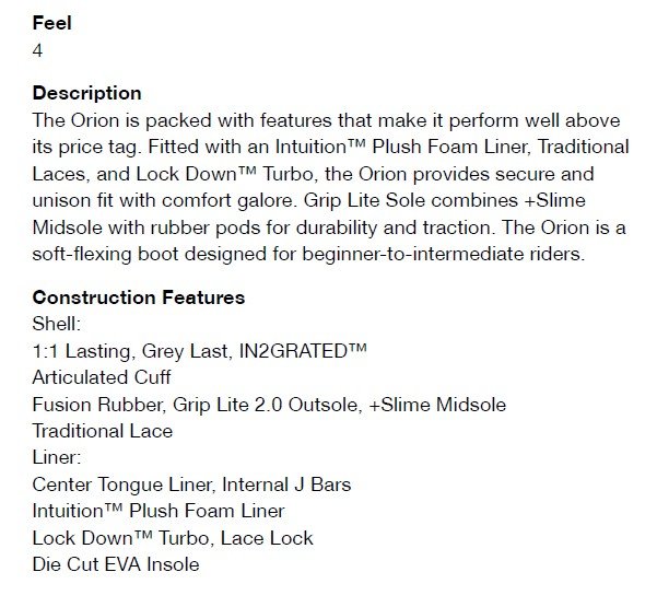 SNB boty Ride Orion jsou nabité funkcemi, díky kterým jsou skvělé i pro začátečníky. Díky pěnové podšívce Intuition™ Plush Foam Liner, tradičním tkaničkám a systému Lock Down™ Turbo poskytuje bota Ride Orion bezpečné a uceleněné uchycení a spoustu pohodlí. Podešev Grip Lite Sole kombinuje mezipodešev Slime s gumovými výstelkami pro odolnost a trakci. Ride Orion je měkká a flexibilní bota určená pro začátečníky až mírně pokročilé jezdce.
