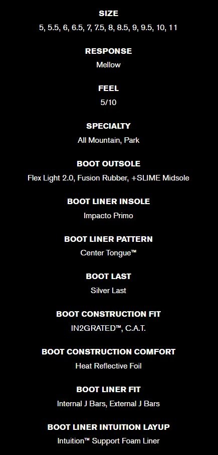 Zlepšuje absorpci nárazu s mezipodešví +SLIME, stabilita a přilnavost je udržována v pružnosti díky použití gumových podložek pod nohama. Jedinečné kanály umožňují lepší pocit z výkonu při freestyle.