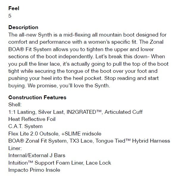 Zcela nová Ride Synth je all mountain bota se střední flexí, navržená pro pohodlí a výkon se specifickým střihem pro ženy. Systém Zonal BOA® Fit umožňuje utáhnout horní a spodní část boty nezávisle na sobě. Pojďme si to rozebrat - když zatáhnete za tkaničku, ve skutečnosti se pevně stáhne horní část boty, zatímco jazyk boty se zajistí přes nohu a pata se zatlačí do patní kapsy. Přestaňte číst a začněte nakupovat. Slibujeme, že si Synth zamilujete.
