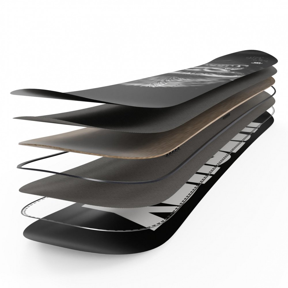 Biax laminát - nejčastěji používaný způsob laminace dodává snowboardu kvalitní pop a lehkou torzní flex. Díky tomu prkno lehce zatáčí a užijete si s ním spoustu zábavy na sjezdovkách i ve snowparku.