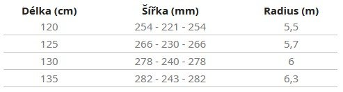 Délka (cm) ... Šířka (mm) ... Radius (m)