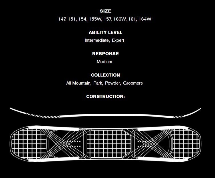 | Technologie ?: | CARBON ARRAY LAMINATES, CARBON SLIMEWALLS®, IMPACT PLATES LAMINATES, LINEAR QUADRATIC SIDECUT, PRE-CURED GLASS FIBERGLASS, RIDE SNOWBOARD TECHNOLOGY, ROLL-IN CONSTRUCTION |