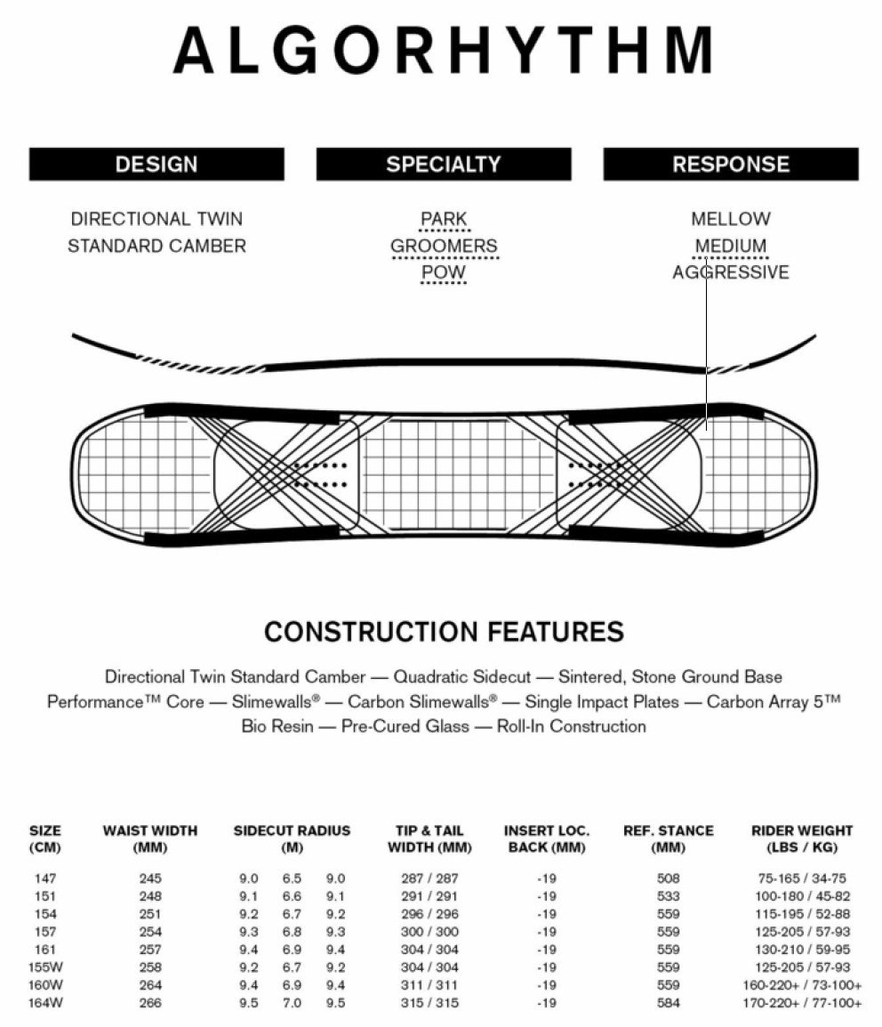The Algorhythm quickly turned into a team and staff favorite at Ride. The versatility of this shape is unmatched. This high-end all-mountain Directional Twin Standard Camber stick is designed to do everything. From park jumps to pow lines to high-speed groomers, this board won't disappoint. The Algorhythm will feel comfortable and familiar to snowboarders looking to up their game. Quadratic Sidecut improves turn initiation/exit and edge grip. A Performance™ Core combines Aspen, Bamboo, and Paulownia wood to provide the perfect balance of strong and light while Carbon Array 5™ provides extra pop without adding stiffness. This high-end all-mountain directional twin is far superior to some one-trick pony freestyle snowboard.