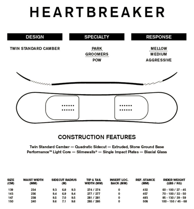 The Heartbreaker is made for all-mountain progression. The standard camber profile combines camber underfoot with rocker at the tip and tail for the perfect combination of snap and easy turn initiation. A Quadratic Sidecut improves turn initiation, exit and edge grip. Slimewalls® provide a smooth ride and increase durability by absorbing impact. The Heartbreaker is a soft-flexing all-mountain board for riders of all ability.