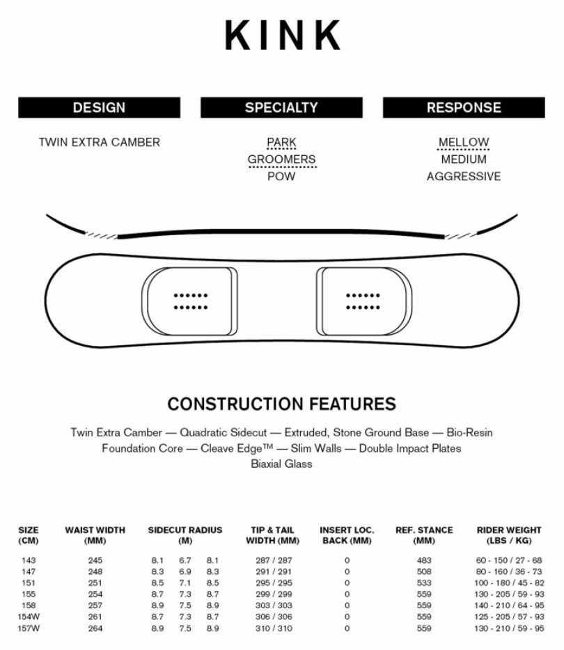 Kink je pouliční stroj. KINK, navržený se zaměřením na předvídatelnost a odolnost pro městské a parkové ježdění, je doma na madlech a výložnících. Deska Kink je volbou pro Jeda Andersona a mnoho týmových jezdců při jízdě na ulici. Profil Extra Camber má prohnutí pod chodidlem pro pop a hladké zahájení zatáček s minimálním množstvím rockeru na špičce pro předvídatelný výkon bez chytání. Quadratic Sidecut poskytuje předvídatelnost a držení hran. Slimewalls® a Cleave Edge™ poskytují hladší jízdu a zvýšenou odolnost. Slinutá skluznice je tvrdší a odolnější. The Kink je prkno určené pro moderní freestyle a street výkon.