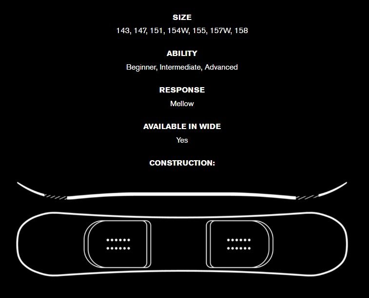 | Technologie ?: | BIAXIAL GLASS FIBERGLASS, CLEAVE EDGE™ STEEL EDGES, IMPACT PLATES LAMINATES, QUADRATIC SIDECUT, RIDE SNOWBOARD TECHNOLOGY, SLIM WALLS |