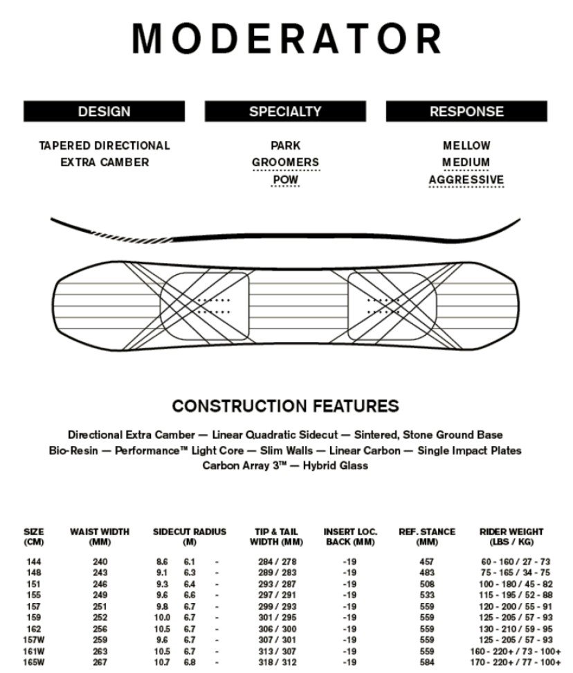 The unisex Moderator is your new quiver killer. Truly one board for everything. A medium (some might even say moderate) flex with a Tapered Directional Extra Camber profile, this board is built for smooth turns and pop while having just enough rise in the nose to float on those deeper days. No need to swap out decks or change your stance depending on conditions. The Moderator should be ridden in a standard length, no downsize needed. The Tapered Linear Quadratic Sidecut is designed for smooth turn initiation and powerful grip without washing out. The Moderator features our Slim Wall construction, where a urethane layer runs along the edge of the board to increase flex and damping to create a board that is at home anywhere on the mountain. This is a premium all-mountain board and features RIDE's Performance™ Light Core, Carbon Array™ 3, Sintered Stone Ground Base, and bio-resin. The Moderator will take you anywhere you want to go.