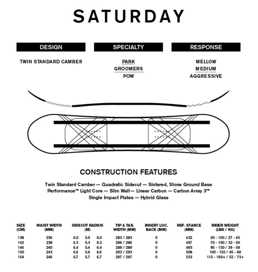 The Saturday is a twin shape that is at home anywhere on the mountain. The standard camber profile provides camber between your bindings for snap and control and rocker at the tip and tail for catch-free riding and float. A Quadratic Sidecut improves turn initiation and exit as well as edge grip. Slimewalls® provide a smooth ride and increase durability by absorbing impact. Carbon Array 3™ provides extra pop and control without adding stiffness. The Saturday is a mid-flexing twin built for the intermediate to advanced riders that want one board for all conditions.